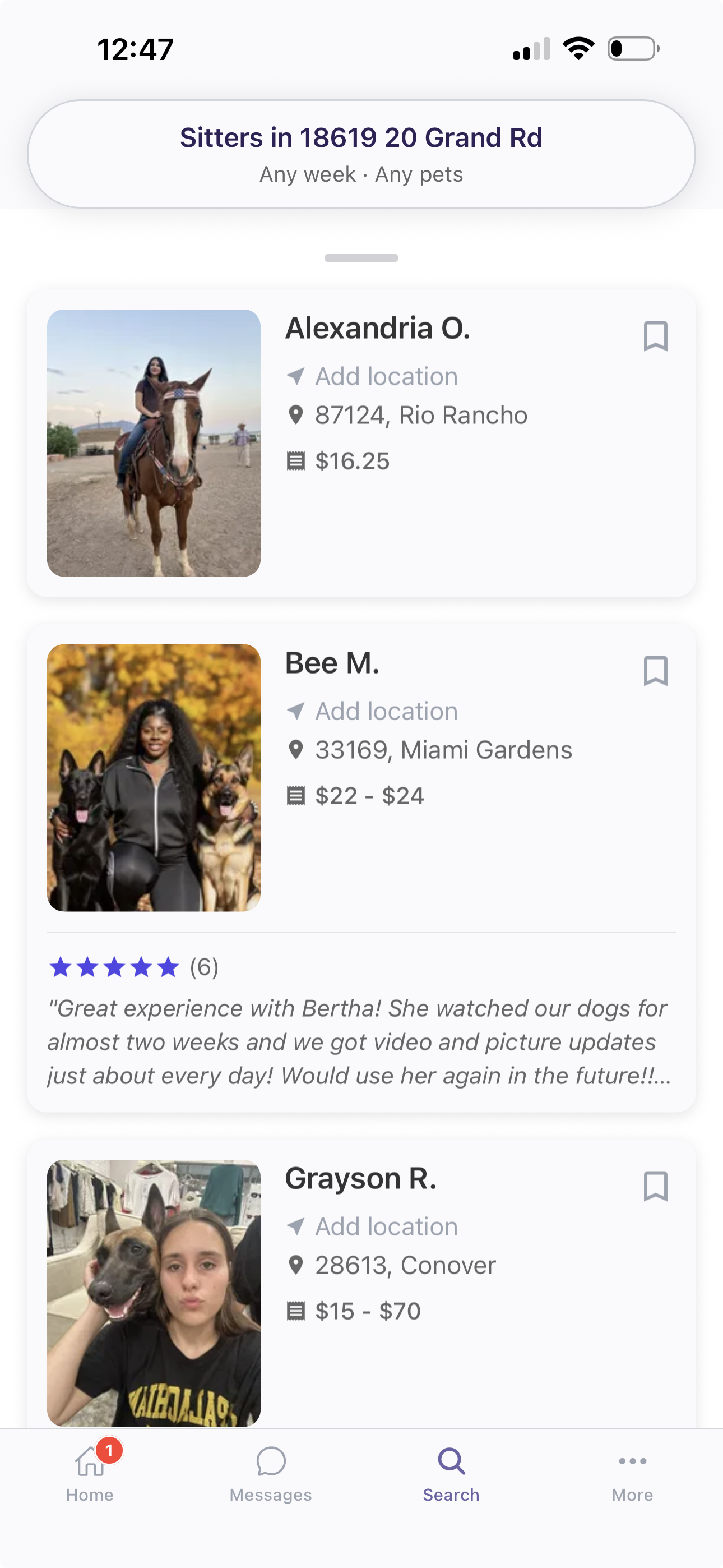 Add dates and pets to see sitters who'll be available.
